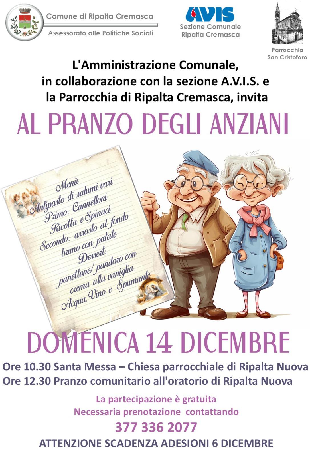 L’Amministrazione Comunale, AVIS e Parrocchia di San Cristoforo organizzano e offrono il pranzo natalizio comunitario: un’occasione speciale per ritrovarsi, stare insieme e dire grazie a chi ha costruito la nostra comunità con amore e dedizione.